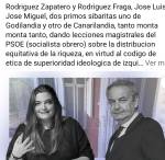 - Rodriguez Zapatero y Rodriguez Fraga, Jose Luis y Jose Miguel, dos primos sibaritas uno de Godilandia y otro de Canarilandia, tanto monta monta tanto, dando lecciones magistrales del PSOE (socialista obrero) sobre la distribucion equitativa de la riqueza, en virtud al codigo de etica de superioridad ideologica de izquierdas : «solidaridad, participacion ciudadana, igualdad de oportunidades y justicia social».
