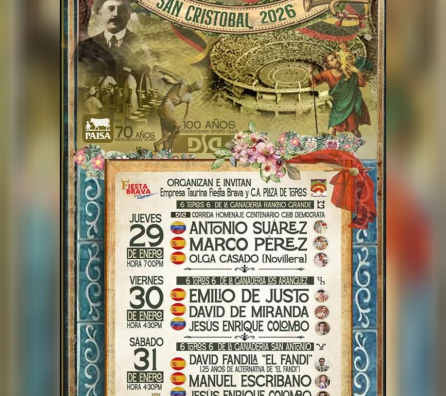 RUBEN DARIO VILLAFRAZ@rubenvillafraz Las mejores galas, como en las fiestas de lujo, resultó la presentación la noche de este viernes de las combinaciones de los carteles de la Feria de San Sebastián del próximo año, el cual tendría lugar el último fin de semana de enero próximo en la capital tachirense. Las tradicionales 3 corridas de toros se enmarcan en el periplo ferial sancristobalense, con … Continúa leyendo Anunciados este viernes en el Ateneo TáchiraVariedad de nombres los que hacen gala los carteles de la FISS 2026