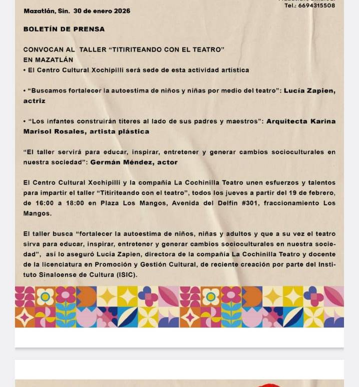 RedacciónFotografía cortesíaMazatlán Sinaloa a 2 de enero de 2026 “El taller servirá para educar, inspirar, entretener y generar cambios socioculturales en nuestra sociedad”: Germán Méndez, actor El Centro Cultural Xochipilli y la compañía La Cochinilla Teatro unen esfuerzos y talentos para impartir el taller “Titiriteando con el teatro”, todos los jueves a partir del 19 de febrero, de 16:00 a 18:00 en Plaza Los Mangos, … Continúa leyendo CONVOCAN AL TALLER “TITIRITEANDO CON EL TEATRO”EN MAZATLÁN